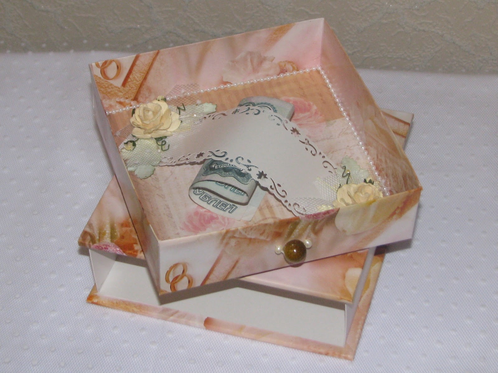 Вот такую коробочку я сделала для денежного подарка на свадьбу.